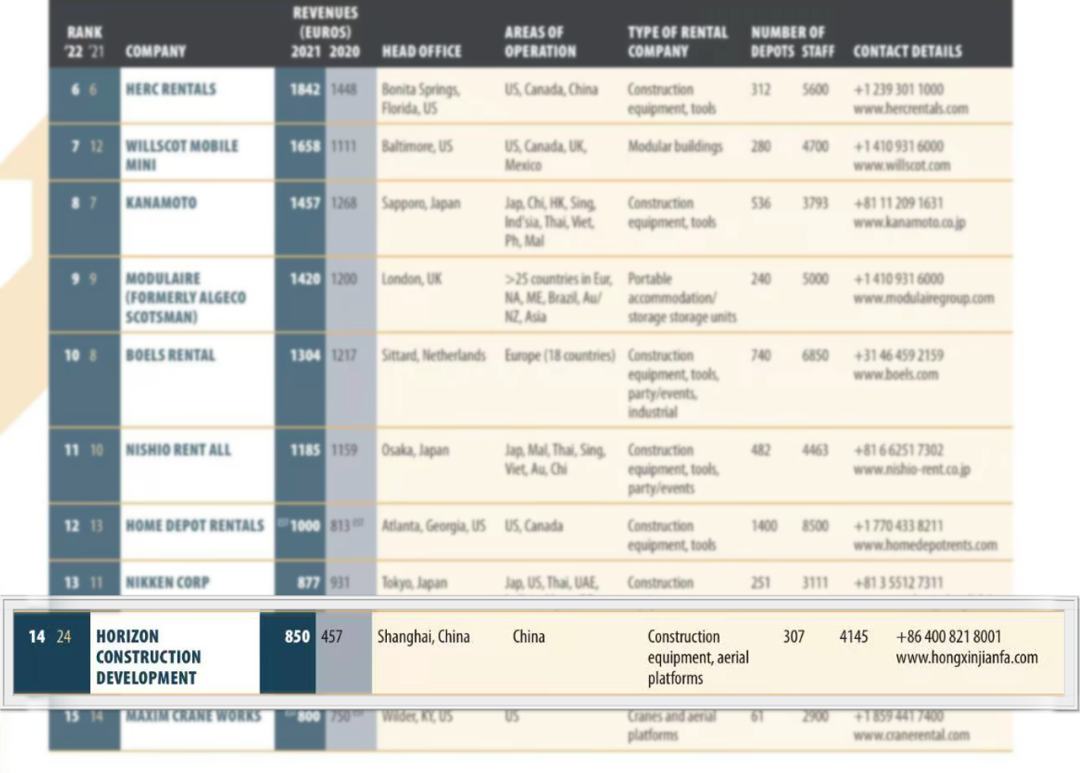近日,國際知名行業(yè)評(píng)價(jià)機(jī)構(gòu)KHL集團(tuán)向全球公布2022年全球租賃百強(qiáng)榜榜單(以下簡稱“IRN100”),遠(yuǎn)東宏信旗下設(shè)備綜合運(yùn)營服務(wù)商宏信建設(shè)發(fā)展有限公司(以下簡稱“宏信建發(fā)”)排名再創(chuàng)新高,相較去年IRN100排名直升10位,達(dá)到全球第14位,繼續(xù)保持中國第1名!